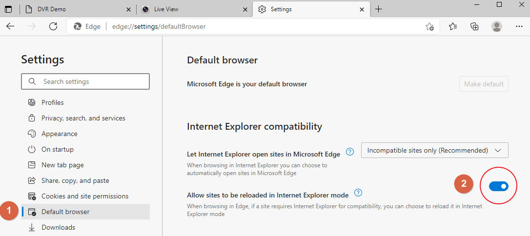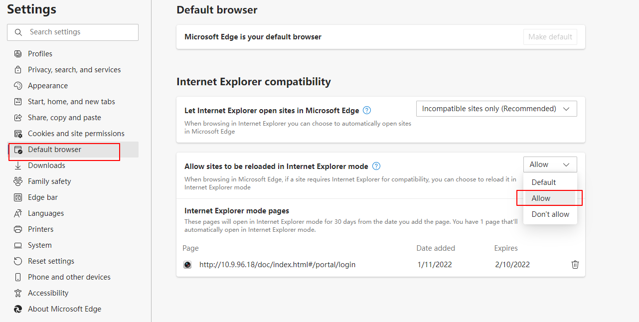 Step 3. Select the default browser, enable allowing the site to reload in IE mode, and restart the browser as prompted.