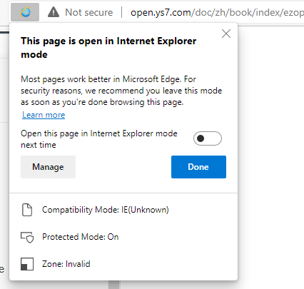 the Edge:IE mode is running with the Protected Mode: ON for Zone: Internet