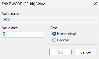 In zone 3 [Internet] right click & create new REG DWORD (32-bit) Value & call it 2500.