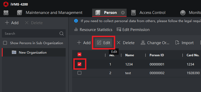 Step 1 Navigate to the "Person" section in the iVMS 4200 and "edit" a person