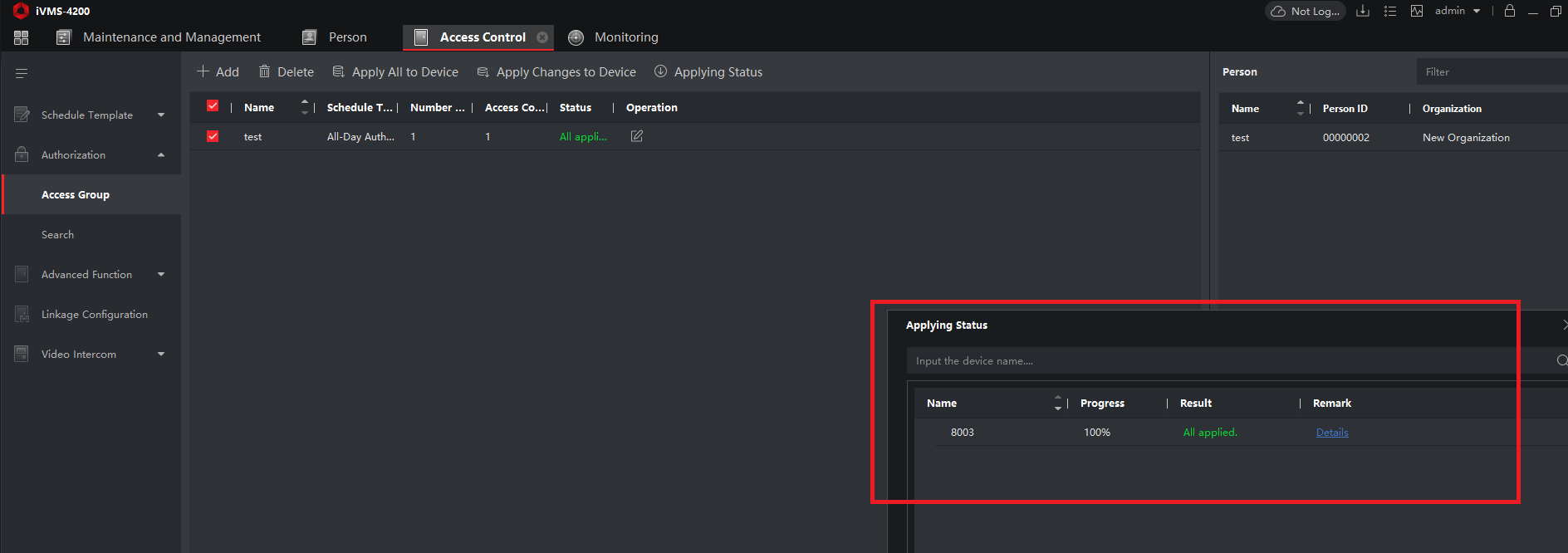 - Select the access group for the outdoor, then click on "Apply Changes to Device". You should then get a "Applying Status" popup that says "All Applied".